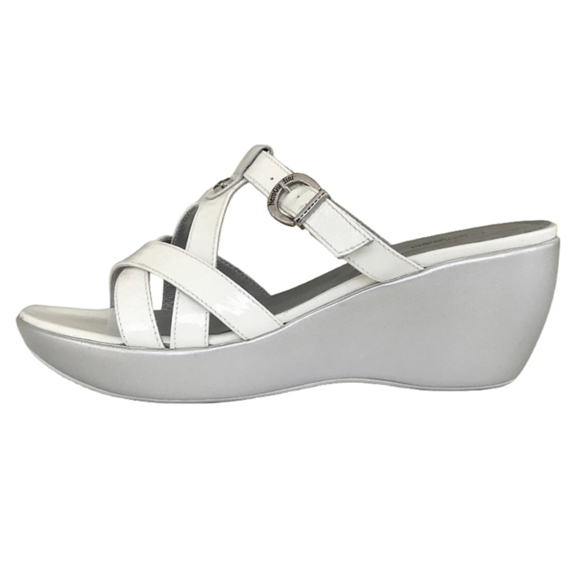 Queste ciabatte con zeppa NeroGiardini sono realizzate in vera pelle e sono caratterizzate da una finitura in vernice bianca. Perfette per l'estate, le fascette incrociate offrono un sostegno confortevole e un look elegante. Ideali per una passeggiata in città o per una serata fuori.