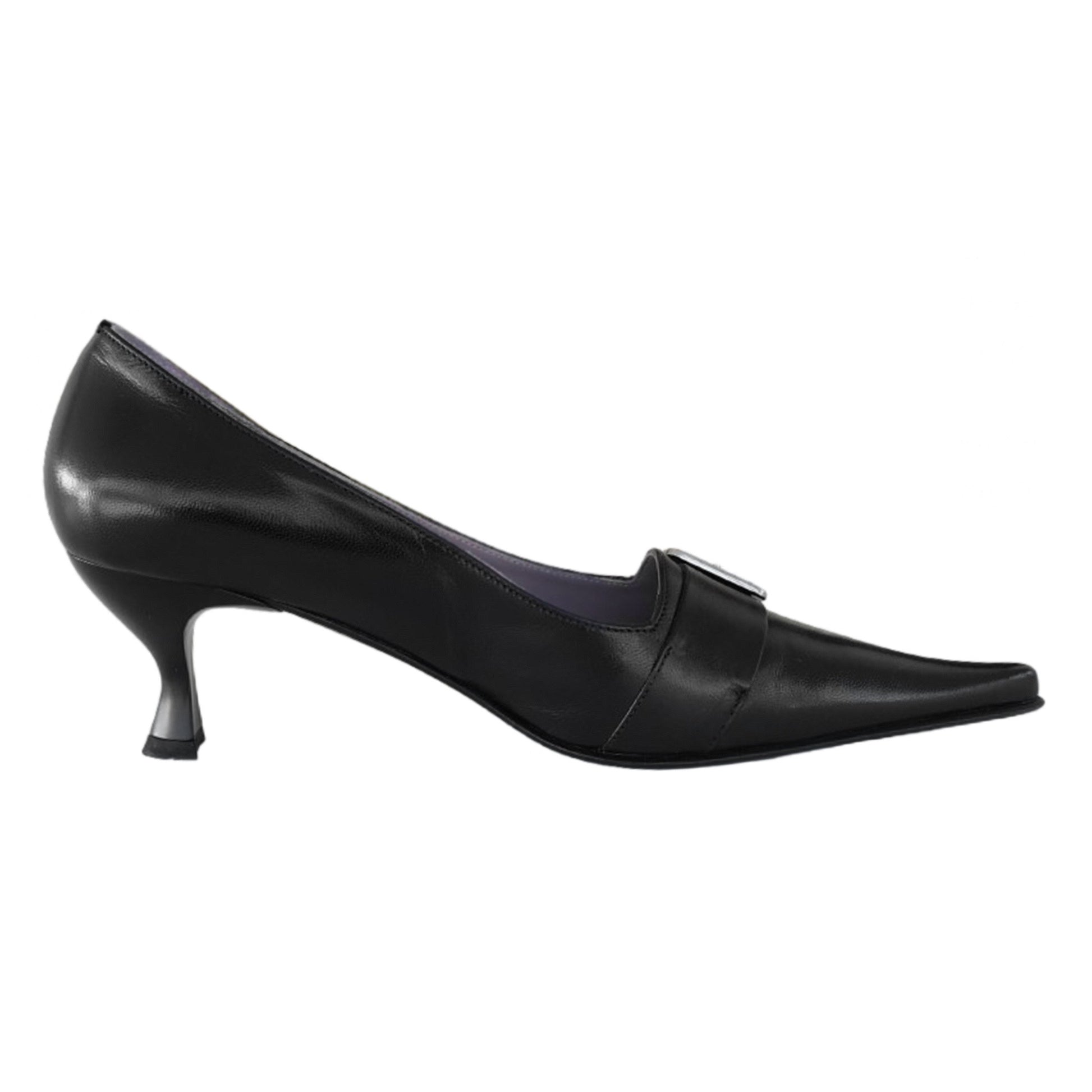Queste décolleté a punta di NeroGiardini sono il mix perfetto di eleganza e comodità. Realizzate in vera pelle nera, presentano una fibbia metallica argento con brillantini incastonati che le rende ancora più raffinate. Ideali per un look impeccabile e un comfort duraturo.