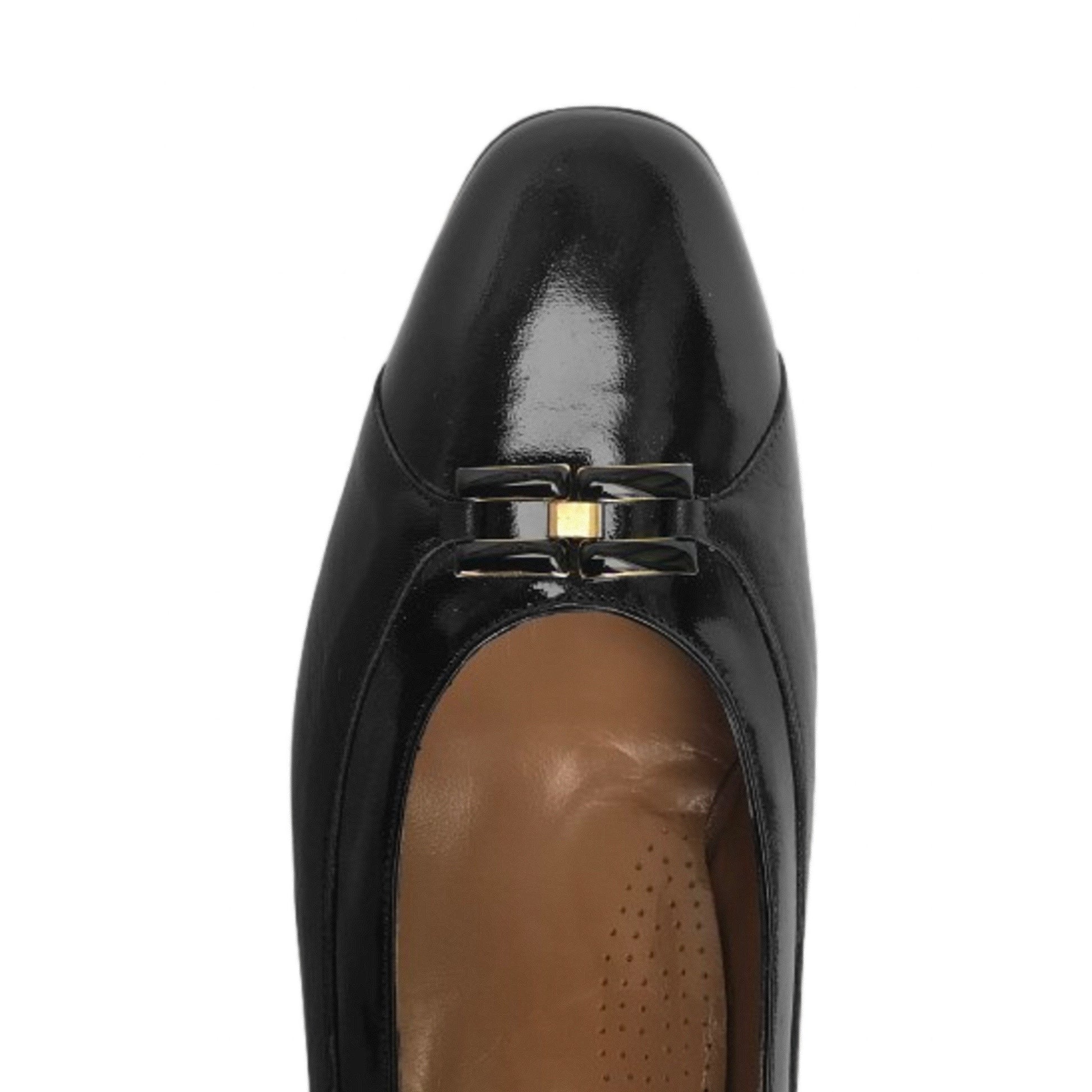 Queste Dècolletè in vera pelle con riporti in vernice sono ideali per ogni occasione grazie al loro tacco di 5,5 cm e fondo in mezza gomma che garantisce un ottimo comfort. Disponibili nel colore nero con un elegante accessorio oro, perfetto per completare ogni outfit con stile e raffinatezza.