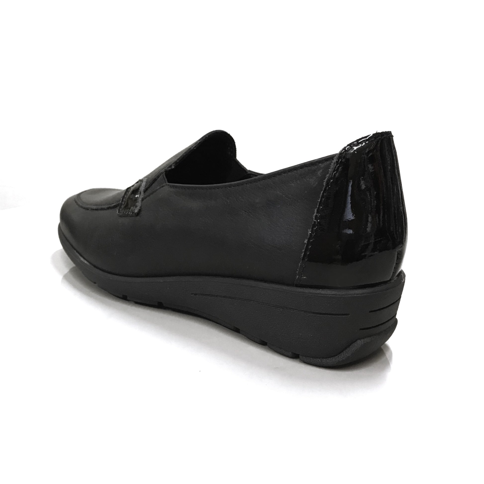 Mocassini Donna Cinzia Soft 7083 - Zeppa Bassa, Elastico Laterale, Vera Pelle, Riporti Vernice Nero
