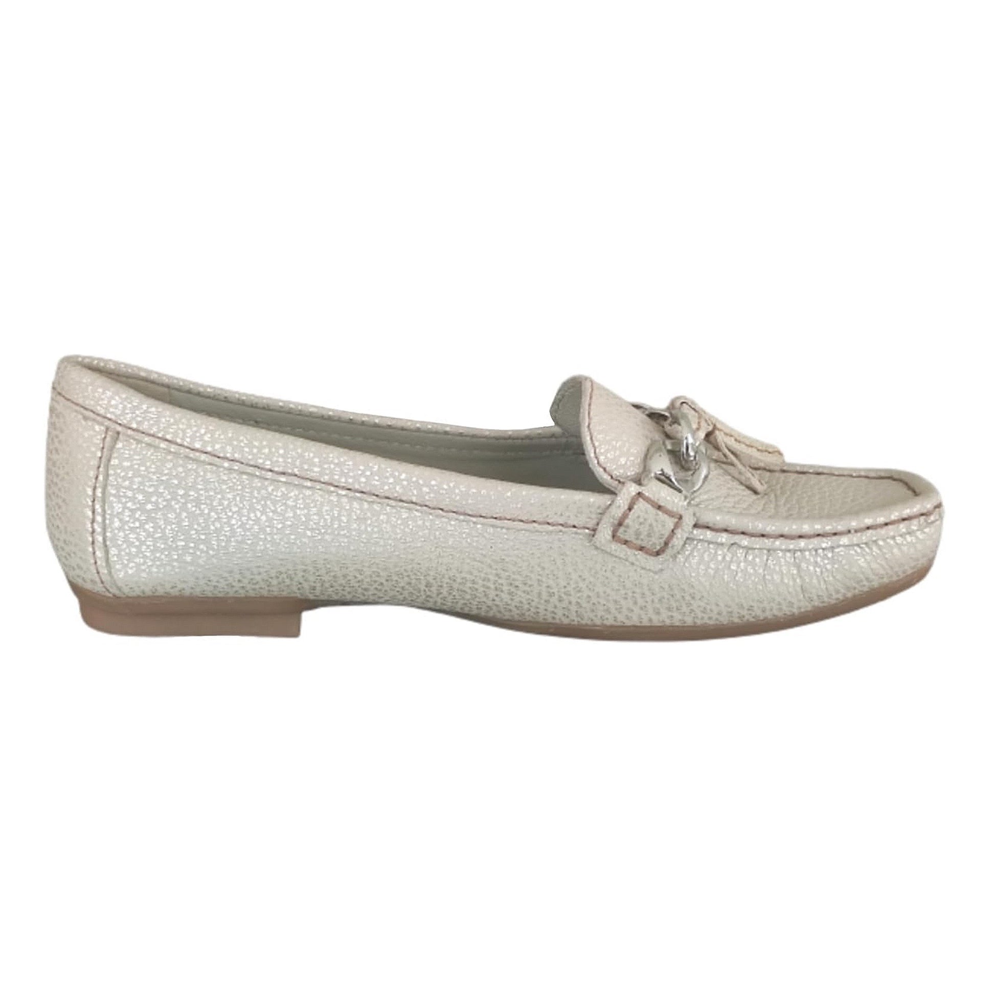 Mocassini in vera pelle beige platinato, ideali per una camminata confortevole grazie al fondo basso in gomma antiscivolo. Aggiungono un tocco di eleganza al tuo look.