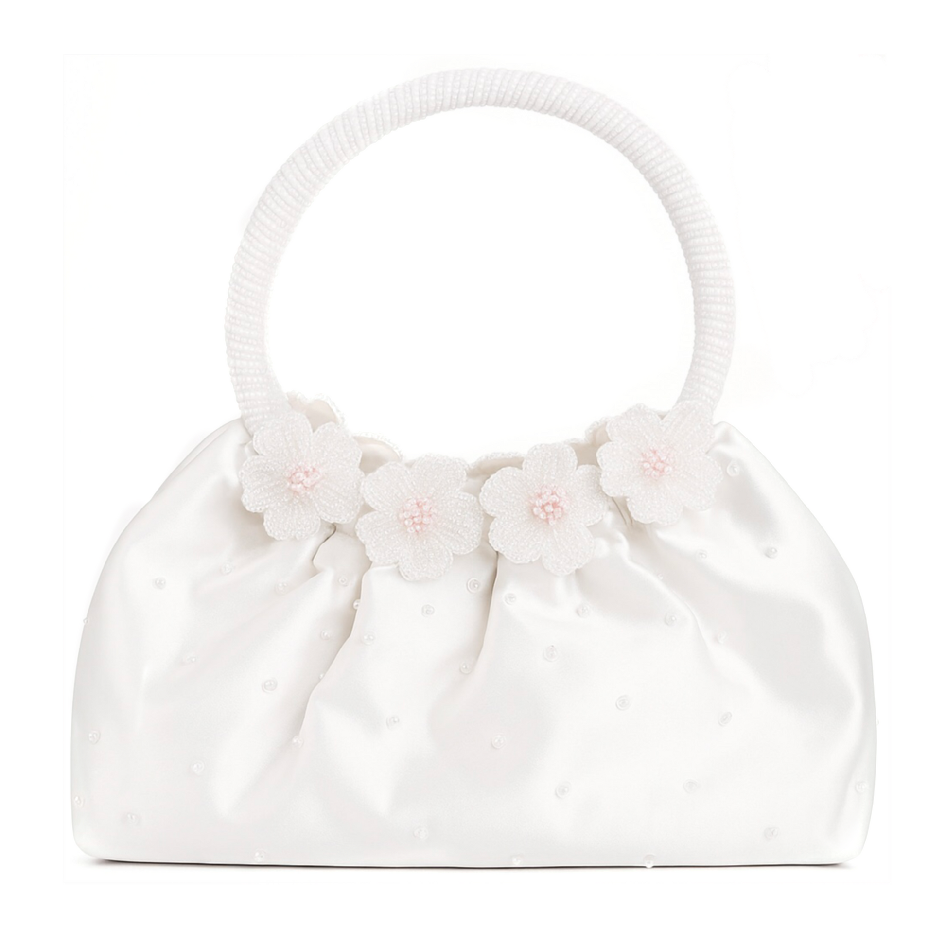 Pochette Albertario in Raso Bianco, Manico con perline, Decorazione floreale