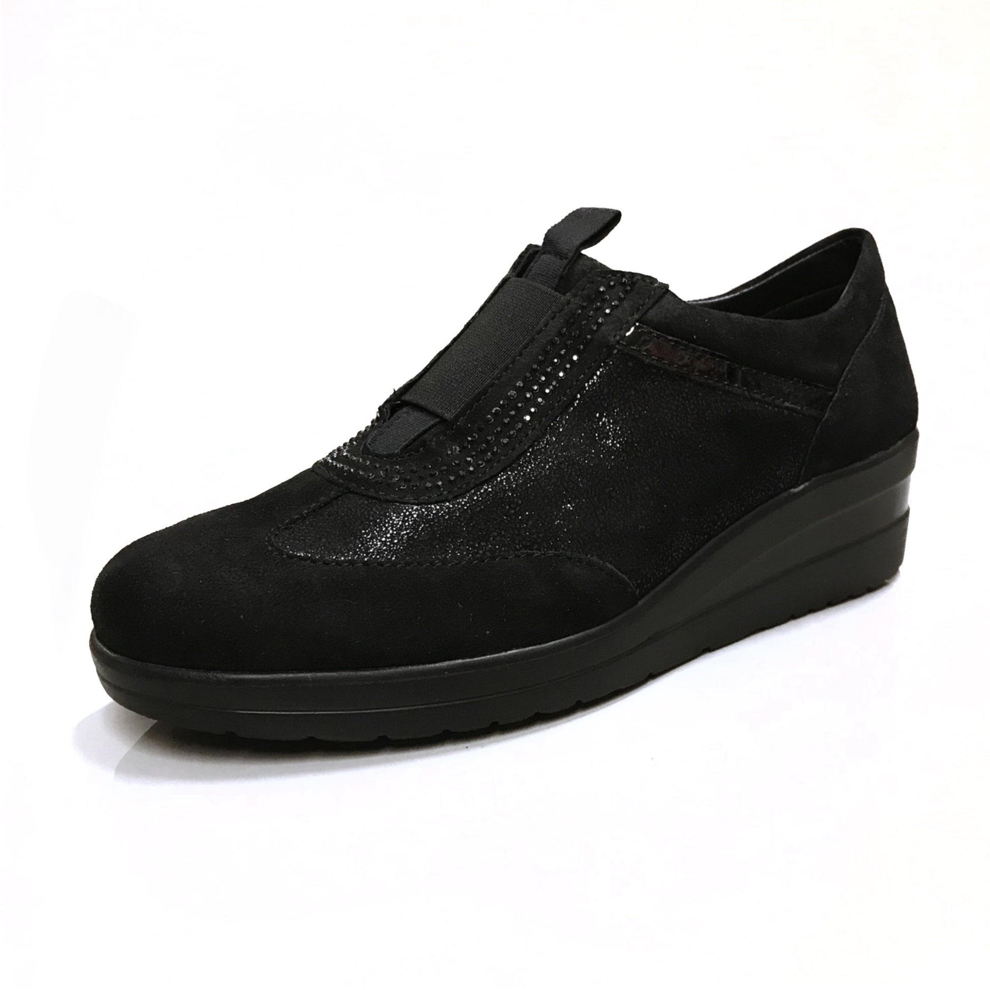 Sneakers Donna Cinzia Soft 235 - Vera Pelle Camoscio Laminata, Nero, Zeppa 4 cm, Elastico - Numero 39 (EU)