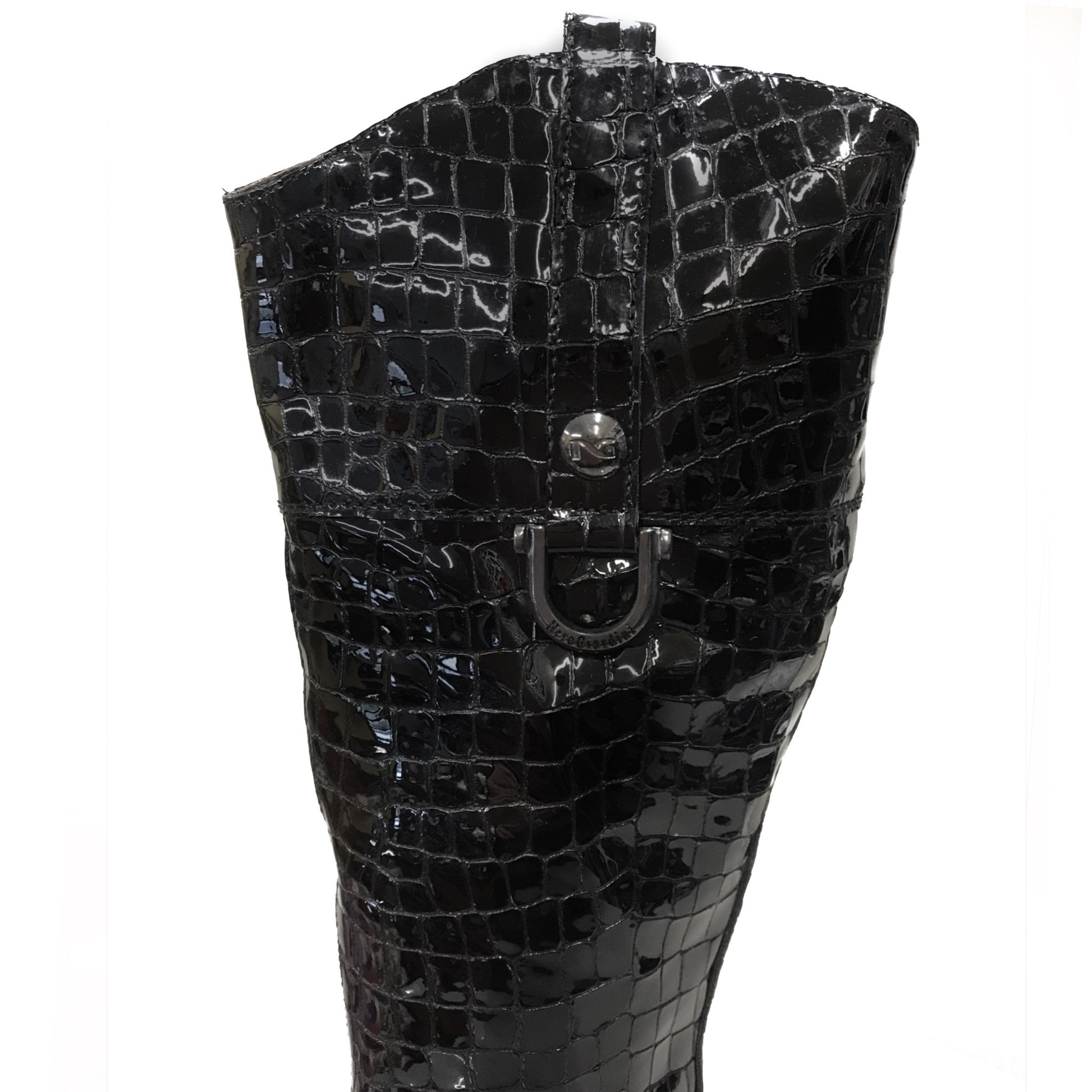 Gli eleganti stivali da cavallerizza NeroGiardini A900186 sono realizzati in vera pelle in vernice lucida per un look sofisticato. Il tacco a blocco basso garantisce comfort e stabilità mentre la stampa in cocco aggiunge un tocco di originalità. La zip permette una facile calzata. Perfetti per un look elegante e raffinato.