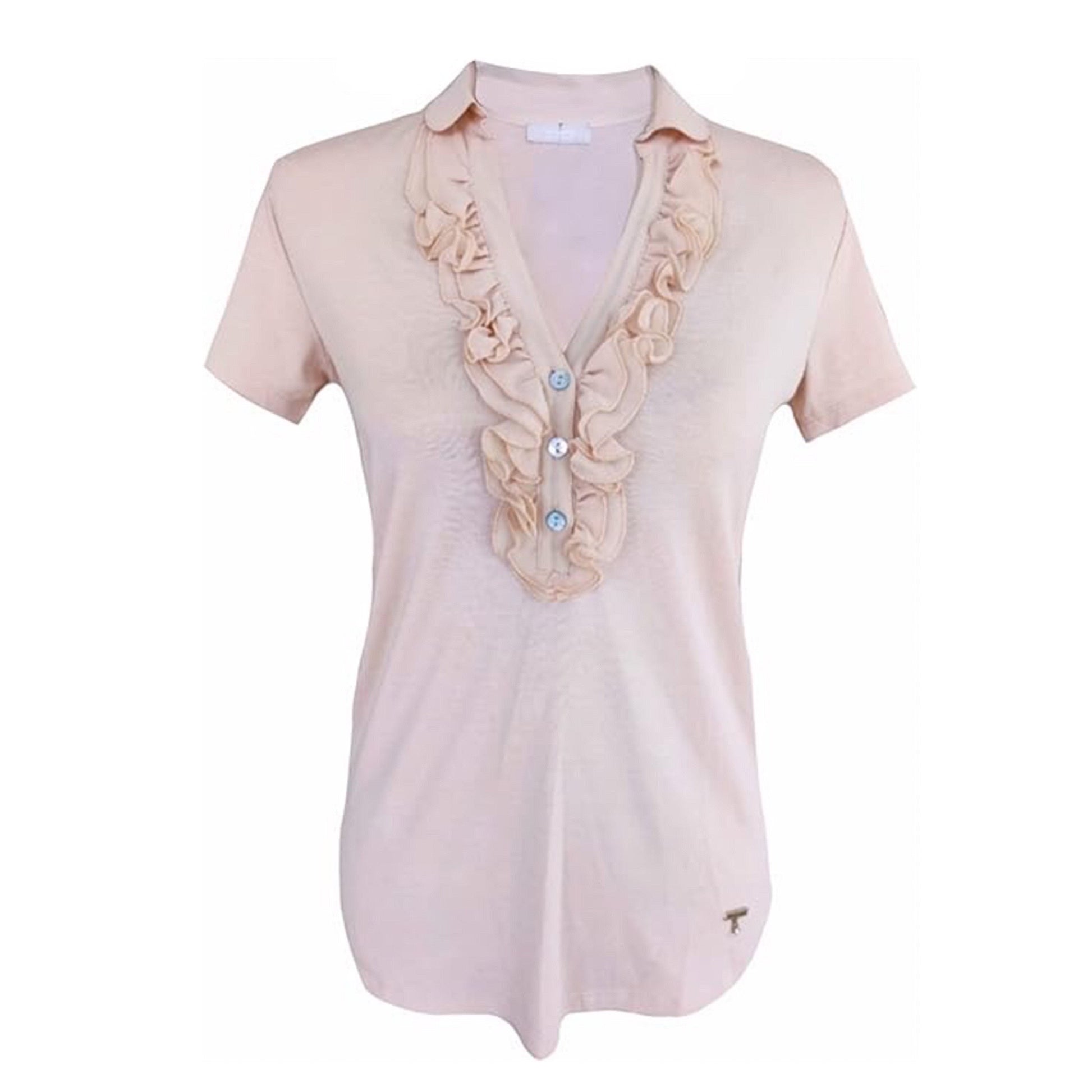 Maglia estiva da donna NeroGiardini P561905D in maglina rosa cipria, con colletto rouches e bottoncini. Il design elegante e il tessuto leggero rendono questa t-shirt perfetta per l'estate. Aggiungi un tocco di raffinatezza al tuo outfit con questo capo di alta qualità.